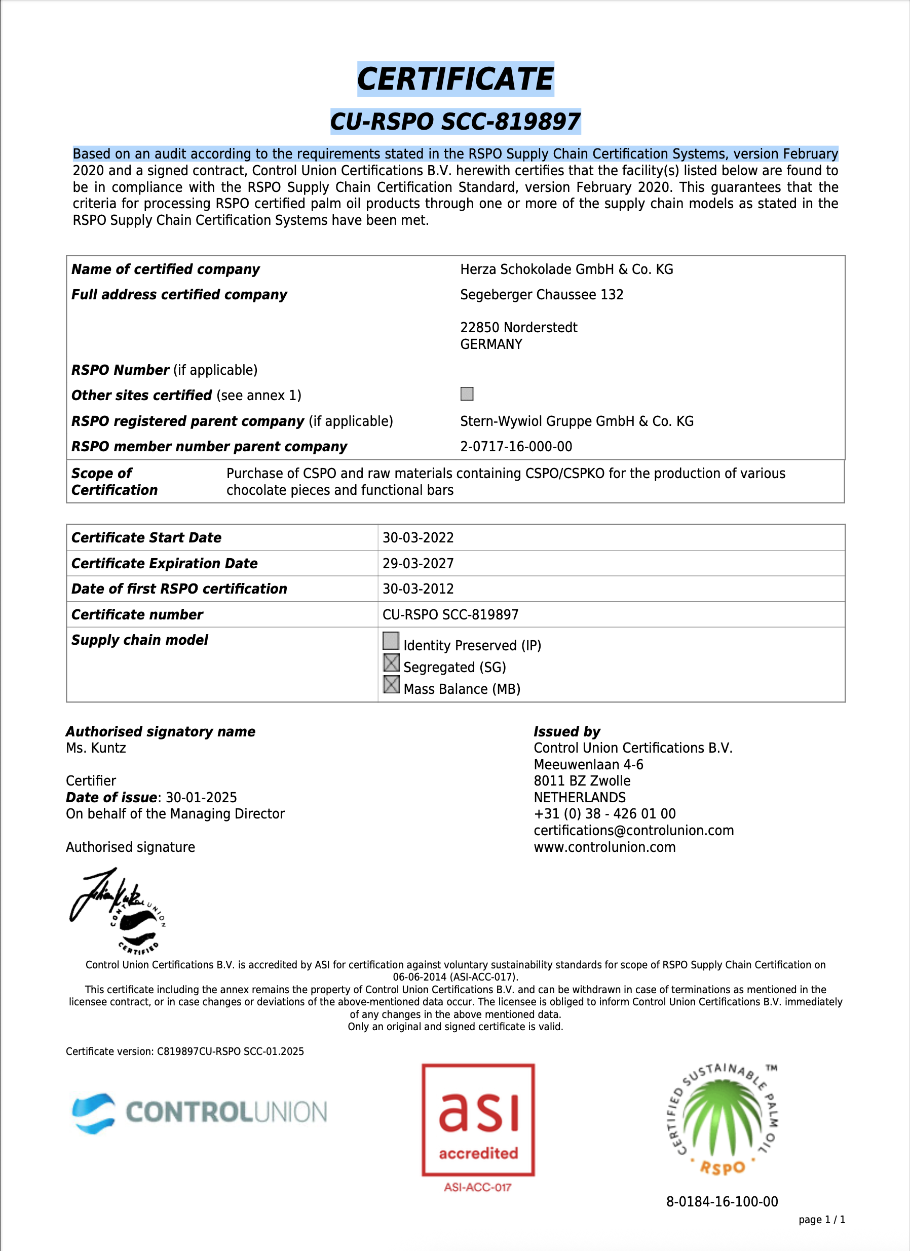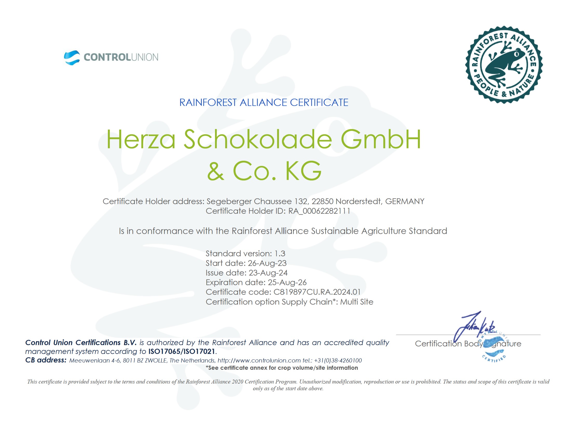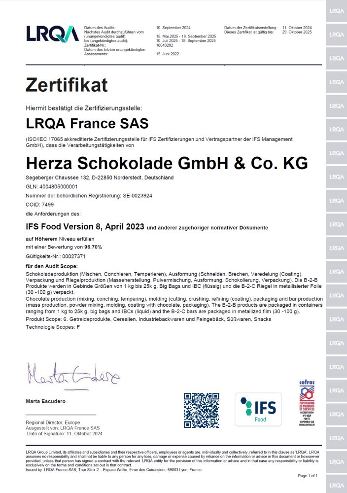 Die Anforderungen an Lebensmittelsicherheit, Produktqualität und Nachhaltigkeit nehmen wir bei HERZA sehr ernst. Alle Zertifikate, mit denen wir diese hohen Standards sicherstellen, können Sie hier downloaden. Zudem finden Sie hier unseren aktuellen Nachhaltigkeitsbericht – mehr dazu lesen Sie auch gerne unter Verantwortung. Aktuelle Pressemitteilungen zum Download finden Sie hier.
